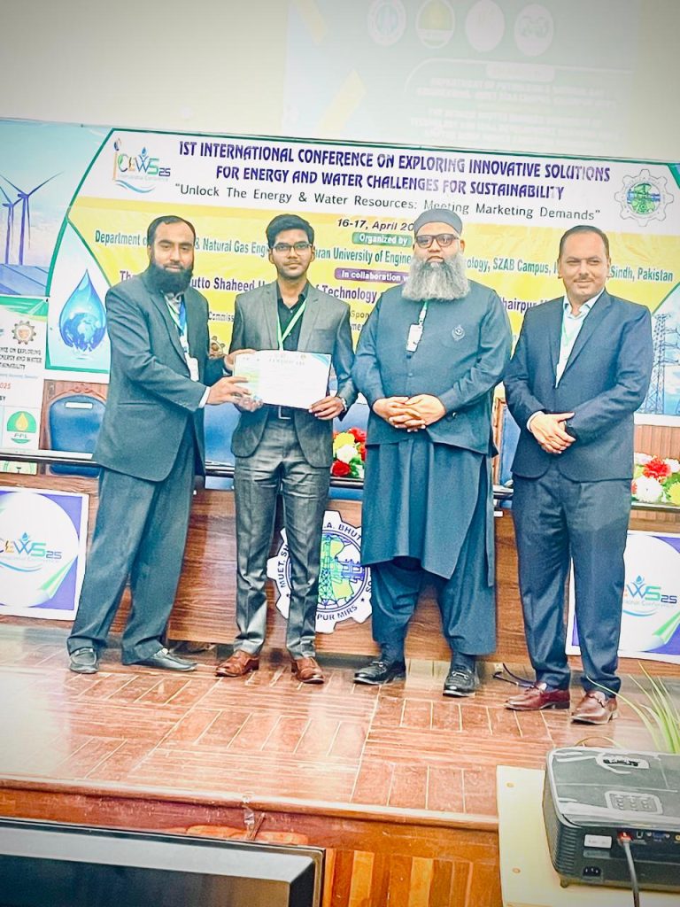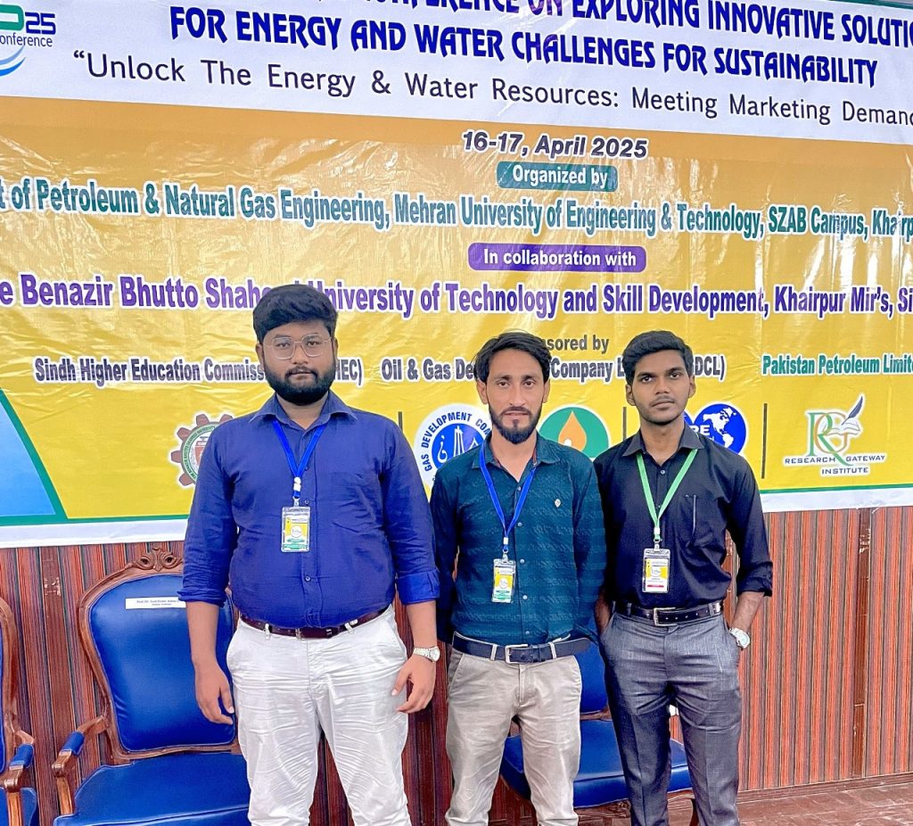 Taha Majid, Zamin Ali, and M. Huzaifa from the 2021 Petroleum batch, under the supervision of Engr. Tariq Ali presented their FYP research at the SHEC Conference at MUET SZAB Campus. Their paper “EOR-CCS Potential of Pakistan in Mitigating Rising GHG Emissions” explored the potential of EOR-CCS in Pakistan for reducing GHG emissions and identified key oil and gas sites for CO₂ capture and storage.